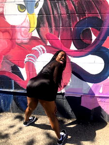 An OnlyFans model posing confidently against a graffiti-adorned wall, captured during the day.