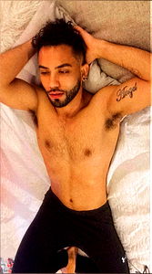 The image shows a shirtless man lying on his back with one hand resting on his chest. He has visible tattoos and is looking directly at the camera. The photo has an artistic, possibly promotional, quality. The man appears to be in his mid-20s and is displaying a confident pose.