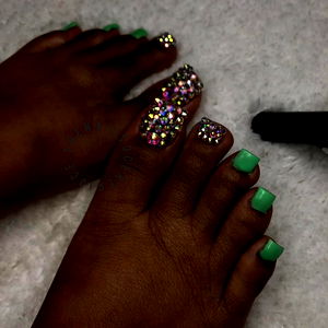 Close-up of a person's feet, adorned with bright nail polish in hues of green, pink, and silver, resting on a white surface. The focus is on the vibrant toenail art that includes glittery, multicolored designs and studded elements. The person's skin tone appears fair, and they are wearing simple, light-colored clothing. OnlyFans model name: Finna.