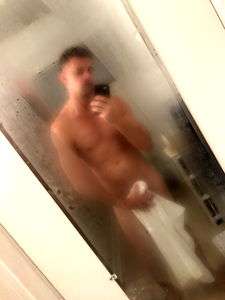 A OnlyFans model takes a steamy selfie in a bathroom mirror, showcasing his fit physique. He holds a towel, ready for his next steamy adventure.