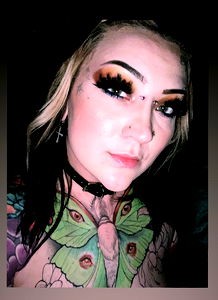 Simone Fox is a captivating model who stands out with her vibrant makeup and creative tattoos. She sports a butterfly tattoo on one of her arms, adding to her distinctive look. Her bold makeup choices and expressive eyes are striking features that draw attention.