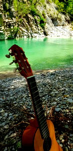 A wooden acoustic guitar sits on a forested riverbank, with a stream and trees surrounding it. The guitar's polished surface reflects the light, emphasizing its craftsmanship.