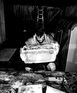 Coach, in the midst of a lush green field, demonstrates how to work with power tools. He stands poised over his latest project with determination and focus.