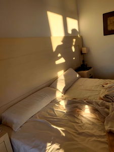 A couple sharing an intimate moment in a dark room, their forms silhouetted against the glow of the window. The scene is captured from a distance, creating an atmosphere of privacy and closeness.