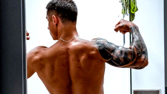 This photograph captures a shirtless man in an indoor setting, presenting a strong display of physicality and athleticism. The man's muscular structure is prominently featured, with his well-defined chest muscles and stomach muscles indicating a high level of fitness. His elbow is slightly bent, suggesting that he might be in the middle of an exercise or movement. Projecting a sense of strength and determination, his bare chest gleams under the light, highlighting the contours and depth of his muscles. His skin, a shade of natural, warm flesh, contrasts starkly with the muted background, drawing all attention to his physique. The background is a simple, unadorned wall, providing a neutral canvas that further emphasizes the subject. The lighting contributes to the image's overall dramatic effect, casting shadows and enhancing the man's muscular definition. This captivating image is a stark depiction of physical strength and human anatomy, creating a powerful visual narrative of dedication and discipline.
