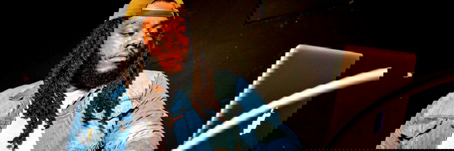 A man with dreadlocks using a Macbook and wearing a denim jacket. He is the only one in the image.