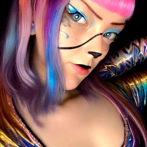 This image showcases a striking, fashion-forward woman with a flair for bold cosmetics. Her face, the central focus of the image, is expertly made up, exhibiting a high level of skill in applying makeup. Her lips are coated in a vibrant, high-gloss lipstick that draws attention to her mouth, while her eyes are dramatically framed with eyeliner and eye shadow. Her long, meticulously groomed eyelashes, possibly enhanced with extensions, add to the overall impact of her eye makeup. The woman's red-colored hair, indicative of hair coloring, cascades around her face, further amplifying her alluring presence. Her style appears to be influenced by the goth subculture, noted for its love of deep, rich tones and dramatic aesthetics. Along with her makeup and hair, she also sports a fashion accessory that complements her look. The accessory, like her makeup, is not just a simple adornment, but rather a statement of her personal style. Despite the boldness of her look, there is an air of sophistication and elegance about her, suggesting a person who is self-assured and not afraid to express herself through her appearance. Overall, this image captures the essence of a person who embraces fashion and cosmetics as a form of self-expression. Her makeover is not just about enhancing physical attractiveness, but also about expressing her individuality, personality, and personal style.