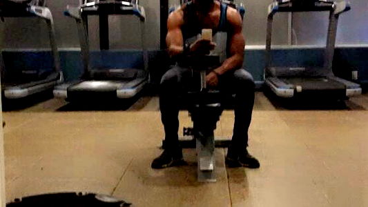 Chris Savage, an OnlyFans model from South Carolina, is captured in a gym setting, seated on a treadmill. He holds a phone in his hand, seemingly ready for an intense workout session.