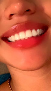 A woman in her twenties, captured in a candid moment. She has curly hair and is sporting a red lipstick look. Her style appears relaxed yet stylish.