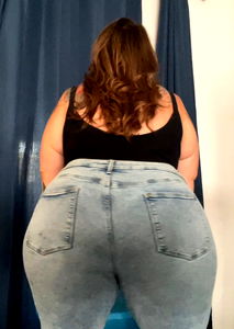 The image captures a full-length shot of a woman standing indoors, her back turned towards the camera. She is wearing casual attire, specifically, a pair of form-fitting jeans. The denim trousers hug her hips and waist snugly, accentuating her figure. The jeans are a classic design, with pockets visible on the backside. Her upper body is also clothed, although the specific type of clothing is not entirely visible from this angle. However, the clothing covers her shoulders, elbow, and the entirety of her back, suggesting it could be a shirt or a top of sorts. The woman's posture is straight and relaxed, her shoulders aligned and her stomach drawn in naturally. The lighting in the room is even, casting a soft glow on her clothing and skin. The setting seems to be a comfortable, casual indoor environment. Overall, the image gives off a relaxed, everyday vibe.