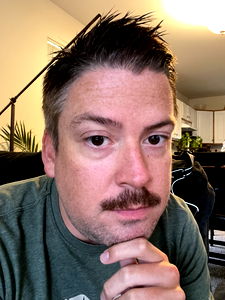 This is an image of a man with a mustache, appearing to be deep in thought. He's wearing a casual green t-shirt and has short hair. His gaze is directed straight ahead, suggesting a moment of quiet contemplation. The setting appears to be indoors with a simple backdrop.