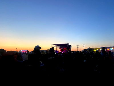 This image captures a vibrant scene of an outdoor concert at sunset. The sky is painted with hues of orange and blue as the stage lights up, illuminating the performers. The audience, dressed in casual attire, can be seen enjoying the performance. The atmosphere is lively and energetic, reflecting the excitement of live music events.