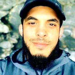 This is a color portrait of a young adult male. He appears to be in his early twenties, wearing a cap, and has a beard. His expression is neutral, looking directly at the camera. The background suggests an outdoor setting. The attire includes a hoodie with a zipper visible.