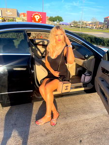 Model Daly D, known for her glamorous fashion sense, is striking a pose inside an Audi car. She's sitting on the passenger seat and appears to be ready for a night out. Her outfit consists of a chic black dress paired with white heels. The background suggests that she is at an outdoor location, possibly preparing for an event or a night out.