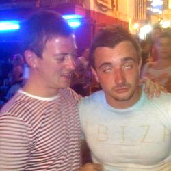 Two men, one making a silly face and the other seemingly unimpressed, share a lighthearted moment. The bar serves as their stage. This photo captures a slice of life in the age of social media.