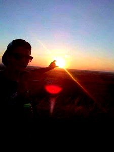 A captivating silhouette of a young man against the backdrop of a stunning sunset, with a vibrant sky and the sun's rays creating an optical illusion of a heart shape. The man stands on a hilltop, gazing into the distance, exuding a sense of calm and contemplation. This image encapsulates the beauty of nature and the serenity it brings.