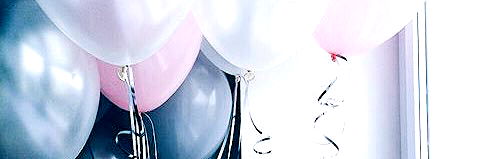 Bright, colorful balloons in a room with natural light. Danya poses playfully.
