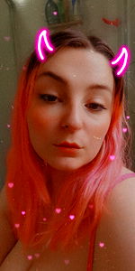 Sexy blonde with pink hair and devil horns in a mirror reflection, capturing her playful vibes.