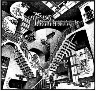A detailed black and white illustration of a staircase leading to the circles of hell, reminiscent of Dante Alighieri's Inferno. Surrealistic in nature, with figures seemingly suspended in time.