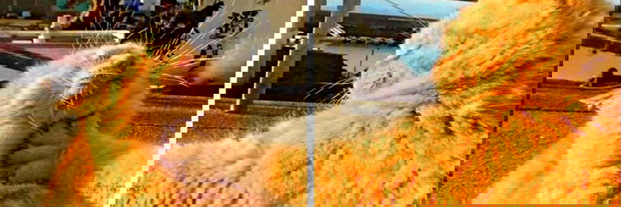 A brown tabby cat with striking blue eyes making a human-like face, seemingly upset or annoyed.