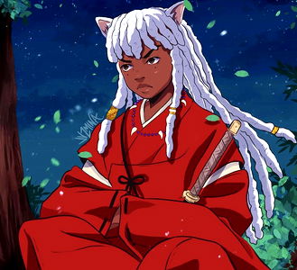 An anime-style character with white hair and a red and white kimono, depicted in a forest at night, holding a sword. The character's intense gaze suggests they are a warrior or guardian. The background features trees and foliage, creating an atmosphere of solitude amidst nature.