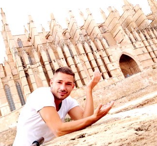 In this vibrant photo, a young man is striking a pose next to one of the most iconic buildings in the world - the La Sagrada Famรญlia. He stands confidently on a street-like area near the cathedral, with its architectural details visible in the background. The man's stance suggests he is enjoying his visit to this landmark.