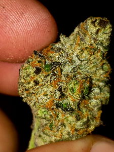 Image captures a person holding a marijuana bud with visible trichomes and pistils, showcasing the flower's texture and resin production. It is a common sight in cannabis culture and dispensaries.