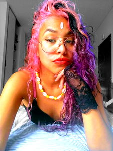 A photo of Onlyfans model Bold Barbie, known for her vibrant pink and purple hair and unique style. She is playfully sticking out her tongue in a candid moment.