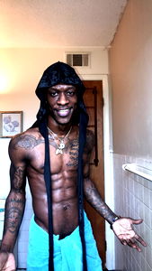 From Indianapolis, Dee Bartel is a model who shares an image of himself in a bathroom, showcasing his toned physique and unique style. He's wearing a black hoodie, a long ponytail with beads, and several tattoos. His pose exudes confidence and playfulness.