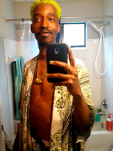 James D. Hertz, a model from Phoenix, Arizona, showcases his unique style with bright colors and accessories. He is seen taking a selfie in front of the bathroom mirror, capturing a moment of self-expression.