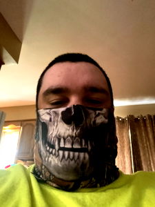 An individual sporting a deer hunter themed mask in a candid indoor setting. The design is simple yet striking with its camouflage pattern and the distinctive white skull print on the face area.