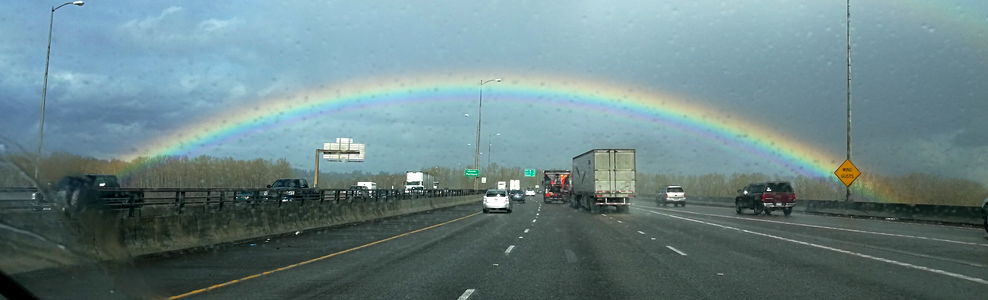 This image captures an expansive, picturesque scene of an open road traveling under a vibrant rainbow arching perfectly across the sky. The road itself, appearing to be a well-maintained highway, stretches out into the distance, a ribbon of smooth asphalt winding its way through the landscape. The thoroughfare is seemingly devoid of traffic, lending a tranquil atmosphere to the scene. The sky is a major element in this image. It's a magnificent spectacle, a blend of hues from the twilight palette, with fluffy clouds dotting the expanse. The most striking feature, however, is the radiant rainbow. Brilliant and full, it stretches from one end of the image to the other, its colors vibrant against the backdrop of the sky. The image is taken from an outdoor perspective, with a view of nature's grandeur on full display. The combination of the open road, the alluring sky, and the majestic rainbow creates a breathtaking scene that conveys a sense of freedom, adventure, and the beauty of the natural world.