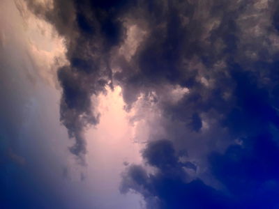 A dramatic scene of a thunderstorm, featuring dark clouds and lightning. The overcast sky is filled with tumultuous weather conditions.