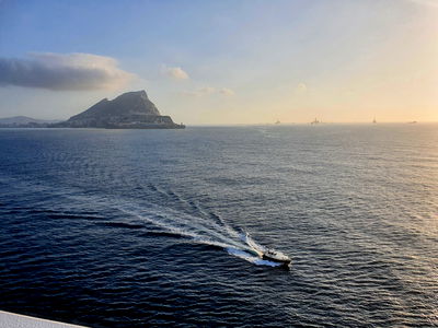 Enjoy the serene ocean view on a clear day. A boat cruises the waters under a beautiful sunset, with an island in the distance and the sky transitioning from hues of orange to deep blue. This is a picturesque scene perfect for relaxation and reflection.