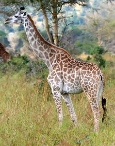 An adult giraffe with brown and white patches, standing on all fours in a grassy area with trees in the background. The giraffe has long legs and its body is slender and elongated.