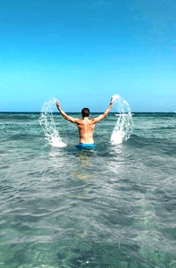 Caught in a moment of fitness and leisure, this shirtless model showcases his toned physique amidst a beach setting.