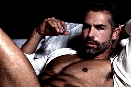 This image captures an adult male in his mid-thirties in an indoor setting, seemingly at ease and laying down. His face is in clear view, prominently featuring a well-groomed beard. The individual's facial features, including his eyes, nose, and mouth, are distinctly visible. He seems to be in excellent physical shape, with his muscular chest and stomach on display. The image vividly showcases his muscularity, with his well-defined pectorals and abdominal muscles standing out. His perfectly toned flesh lends a sense of athleticism to the entire scene. The man is shirtless, with the bare skin of his chest and stomach visible. The lighting in the room accentuates his muscular contours. His elbow is bent, possibly supporting his weight as he lies down. Overall, the image exudes a sense of relaxed strength, the man's muscular structure contrasting with his relaxed posture. The indoor setting adds a sense of intimacy to the photograph.