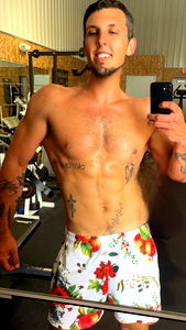 Bodybuilder Dizzy showcasing his toned physique and tattoos, flexing for a mirror selfie in the gym. From Green Bay, Wisconsin.