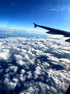 An aerial view captures the wing and fuselage of a commercial airplane in flight over a cloudy sky, taken from a window seat. The aircraft appears to be in a cruising phase of its journey.