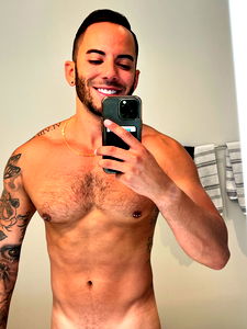 A revealing photoshoot of the popular OnlyFans model DomenicValentino, captured in a candid moment. See his shirtless physique and tattooed arms.