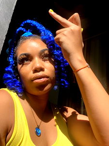 An Onlyfans model with blue hair and a yellow top. She is making a peace sign gesture with her hand.