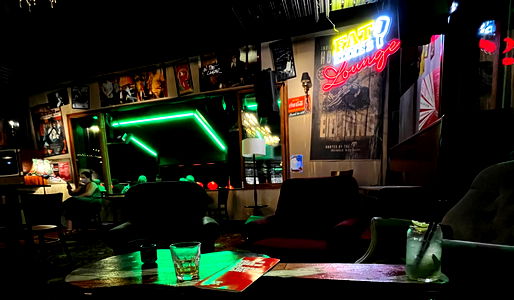 The photo depicts the interior of a bar at night, with neon lighting and various tables. The bar appears to be open and bustling with activity. There is a neon sign that reads 'Happy Hour', indicating that special drink prices are available during certain hours of the evening.