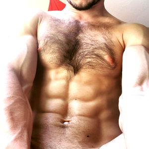 This image showcases a shirtless man, presumably in his late thirties, posing against a plain indoor wall. His muscular physique is prominent, with chiseled chest muscles, a well-defined stomach, and robust biceps. The man's neck and shoulders also exhibit a muscular build. The skin tone is quite natural, suggesting that the image is taken in good indoor lighting conditions. His face is adorned with a well-groomed beard, which frames his smiling face. The smile, coupled with his sparkling eyes, lends a charming quality to his rugged yet pleasant demeanor. His facial features are expressive and his skin appears to be in good condition. This man's smooth, bare chest and his generally well-maintained physique suggest that he might be a fitness enthusiast or perhaps a professional athlete or model. Overall, the image exudes a vibe of health, fitness, and positive energy, with the man's smile and physique being the key focal points.