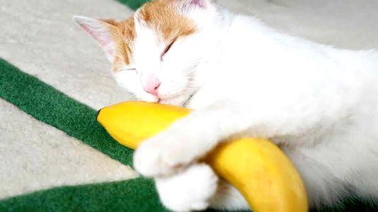 An orange tabby cat is playfully holding onto a bunch of bananas, captured in a candid moment that showcases the cat's curiosity and charm. This photo could be used for pet-related content or to promote pet-friendly products on social media platforms.
