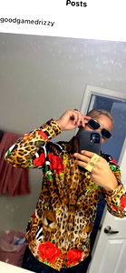 A man exuding confidence and style, dressed in a colorful shirt and pants. The outfit is accessorized with flashy jewelry and unique footwear.