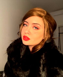 This image captures a young woman, approximately 28 years old, in an indoor setting. She possesses a distinct fashion sense, seen in her choice of clothing. She is wearing a black coat that appears to be made of fur, signifying a sense of luxury and sophistication. The coat, with its sheen and texture, is a prominent feature of the image. The woman's face is perfectly framed in the center of the image, drawing the viewer's attention. Her facial expression and features are clear and well-defined. She has expertly applied lipstick, which adds a pop of color to her otherwise monochrome ensemble. Her hair, visible despite the attention-dominating coat, adds an extra dimension to the image. The backdrop is a simple wall, which serves to highlight the woman and her clothing even more. The overall color scheme is predominantly black, which adds a dramatic and intense mood to the image. The photograph seems to be taken with a keen eye for fashion and style, beautifully capturing the elegance of the woman and her attire.