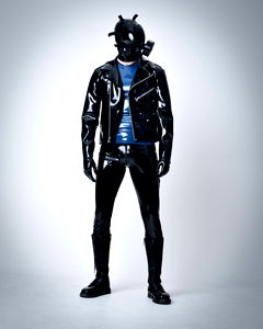 A creative photoshoot capturing the character of DukeJack, donned in a full-body black latex suit with a matching helmet and leather jacket. The model is standing against a white background, emitting an air of mystery and innovation.