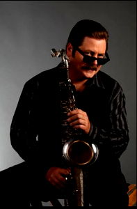 Duke, a singer with a saxophone, in a relaxed pose. A man with a mustache and sunglasses is captured in this image, evoking a sense of coolness and jazz vibes.