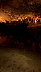A captivating image capturing the awe-inspiring depths of an underground cave, bathed in natural light filtering through small openings. The unique perspective invites the viewer to explore the intricate web of stalactites and stalagmites that adorn this subterranean wonderland.