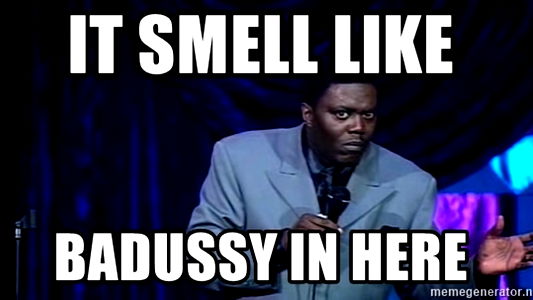 The comedian is performing his routine, holding the microphone and making a joke about being badass. The stage has a blue curtain in the background.